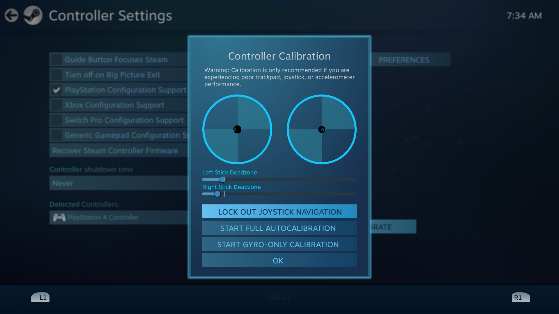 — Change a deadzone via Steam, calibrate a virtual DS4 via the Steam.