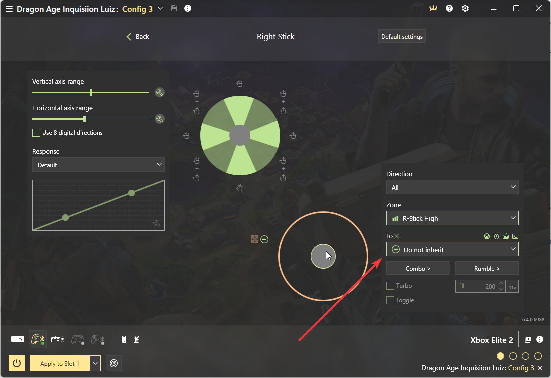 Maybe it’s a bug or I’m doing something wrong. I want to do something quite simple: my right stick on Xbox series X controller to be remapped to behave as a mouse (but with the right button always pressed so it can move the camera on the game). In other words, if I move the stick up it would trigger Mouse up+ right mouse button (the same would apply to each direction). I managed to do that by mapping each side of the stick to the mouse up/down/left/right. On the advanced settings I used the “ZONE” options “to” “RIGHT MOUSE BUTTON” and on “DIRECTION” I selected “ALL”. . It worked as intended. Not sure if that’s the correct way though.