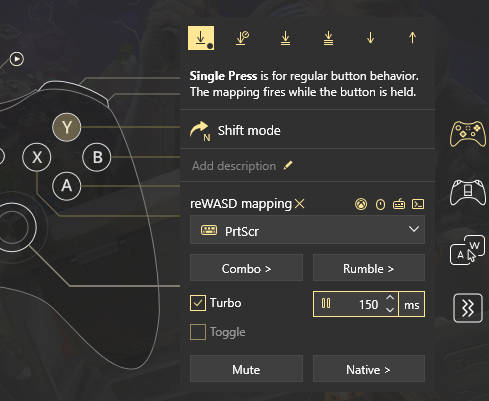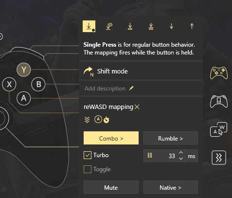 Trial-ing reWASD but struggling to use it. I guess I don't understand the basic configuration. I have a working Xbox 360 controller with Project64, and wanted to add a "swim fast" by mapping Y button to a cycled A button, but even with mapping nothing, there's no controller response at all within Project64 if reWASD is on. I'm not understanding all the terminology, either. Is there a way to have reWASD still make the controller work "as is" and then I can try to tweak more buttons? Project64 works fine with my controller, I just wanted to map unused buttons to something useful.