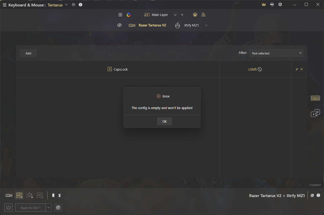 It seems that no matter how many binds I add to my input device (a Razer Tartarus V2, in this case) reWASD will not allow me to apply the config due to it being "empty." I've posted a picture for proof, but note that it only shows 1 bind as a test. I've had this happen with many binds set up, both with my Razer Tartarus V2 and with a Flydigi Apex 2 controller.