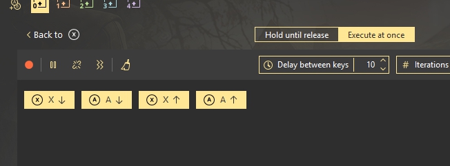 You need to create an Execute at once combo and drag-n-drop X and A down and up nodes, so these buttons are pressed together: X-down, A-down, A-up, X-up: