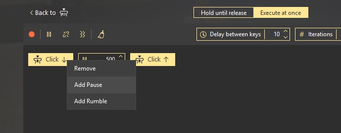 Now, I can for example add a pause between press (arrow down) and release (arrow up). The combo below does the following: click will be pressed and released after half of a second: