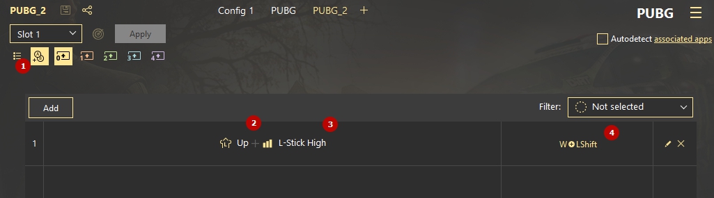 So, first, we need to add the movements to the main configuration. I'm adding WASD to Stick and unmap it fully. Then, I go to Advanced setting and set Ctrl as a Low zone for this whole stick. Then, I go to Shortcuts (1) and create the one that will work for Up direction only (2) in the High zone only (3): W+LShift (Hold until release combo). So, once you move your stick to the edge while moving up, you character starts running forward. Once you move stick to other directions, we have nothing.