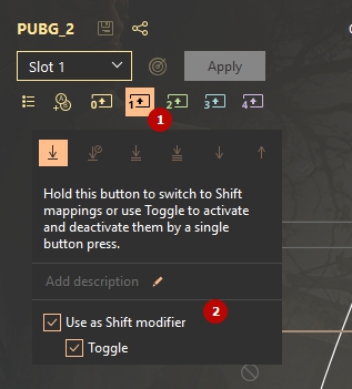 Then, I go to Shift (1) and pick Left Bumper as a Shift modifier with Toggle (2). This button will switch Stick to the aiming mode. Inside the Shift, we also need to unmap the stick and set it to WASD.